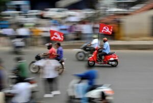 Workers from different trade unions ride motorcycles during a protest rally as part of a nationwide strike in Bengaluru