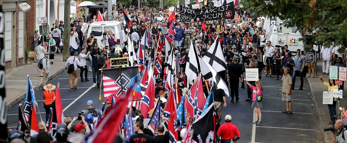 On Friday night, a torch-wielding mob chanting Nazi and other racist slogans (e.g. “blood and soil,” “Jews will not replace us”), some doing Nazi salutes, surrounded, screamed “White lives matter” and “anti-white” at, a small group of college student counterprotesters who had linked arms around a statue and had a banner. They then threw fuel at them, beat them with lit torches, pepper-sprayed them, and punched them (including pepper-spraying a girl in a wheelchair).
