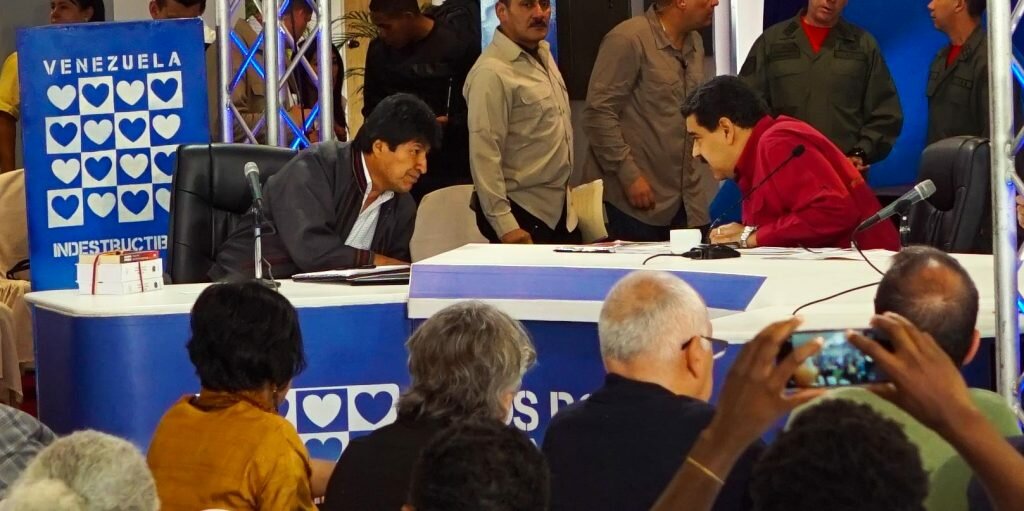 Among the international delegates Evo Morales, President of Bolivia, shared his undivided solidarity with Maduro. Other delegates were Fernando Gonzalez, former “Cuban Five” prisoner and President of the Cuban Institute for Friendship with the Peoples; Maria do Socorro Gomes, president of the World Peace Council; the son of murdered President Patrice Lumumba, from Congo; and Sonia Gupta, renowned academic from India, who gave a strong speech praising Venezuela for the “creation of a new value system and a new model of democracy” to replace the “worn out model.”