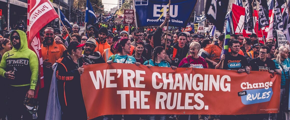 A union protest in Melbourne’s central business district on May 9 shut down roads and tram routes as up to 100,000 workers rallied for new pay deals. Thousands of union members carrying banners and flags marched from the Victoria state Trades Hall as part of the Change the Rules rally that lasted for several hours.