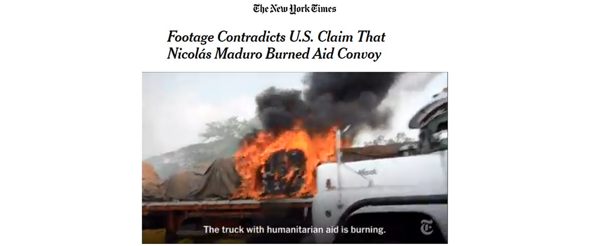 How about the “aid” convoy on February 23? Did it succeed? The hoped-for breach of the border did not happen. Neither were there mass defections from the army. Guaido’s supposed mass support was shown to be largely inflated. And there was no effective false flag to serve as a pretext for US military intervention. True, the firebombing of an “aid” truck on the Colombian side of the border was blamed on the Maduro administration, but video evidence quickly circulated around the world showing that it was caused by a Molotov cocktail thrown by a provocateur sympathetic to Guaido. By mid-March, even the New York Times was admitting as much.