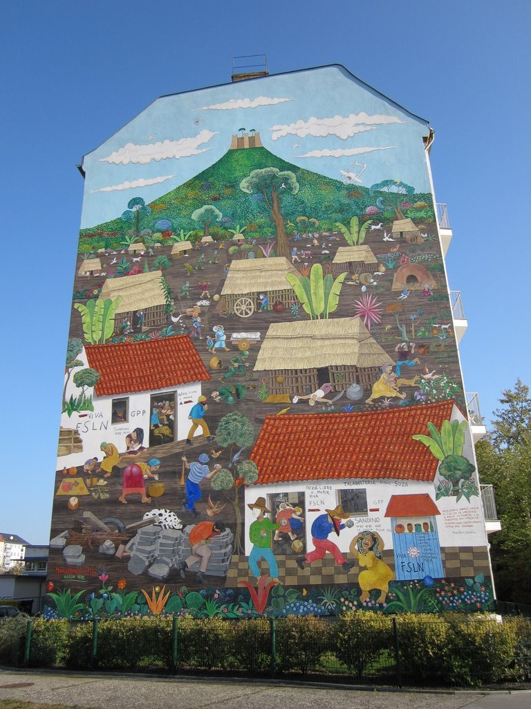 No one on Berlin’s main eastbound traffic artery could miss one of the two murals, five stories high, 2745 square feet in area, in shiny bright, red, green, yellow and blue colours up to the gabled rooftop of an older, isolated apartment building. A first glance sees an Indigenous village in Nicaragua with red-roofed huts, dogs, a spotted hog, chickens amidst beautiful tropical trees, flowers and birds in a jolly rural setting.